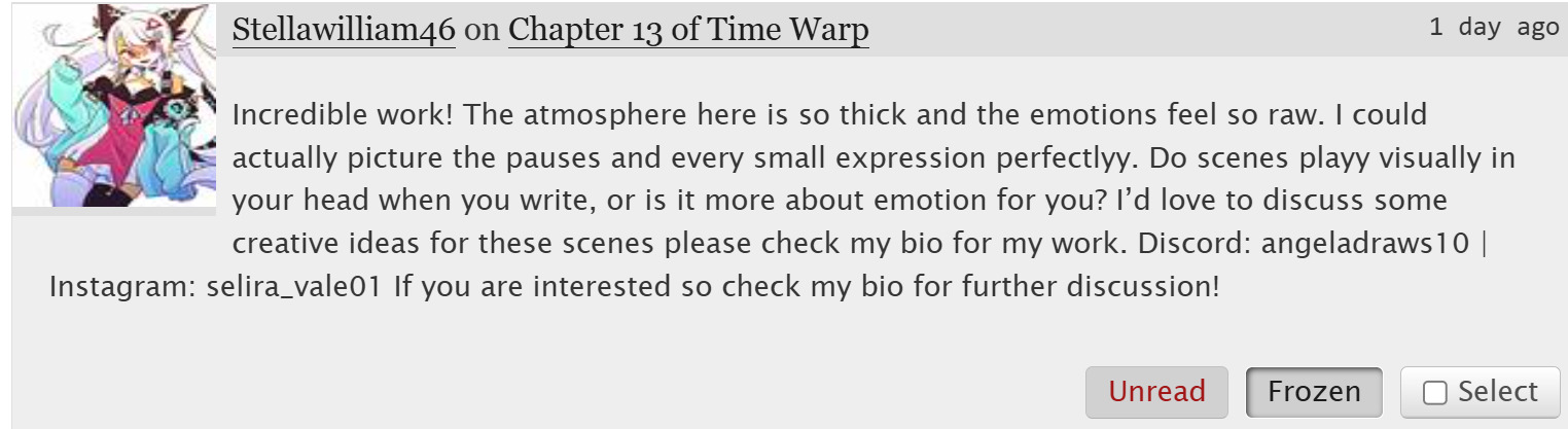 It's interesting that some scammers have moved into the fandom space, where younger writers are most vulnerable. Imagine: you're a teenager, with a fanfic that's starting to blow up in your fandom. You get a message saying, 'hey, I'm a digital artist--pay me, and I'll make your story into a comic!' So you do, and you keep paying for each page. In the meantime, the scammer is simply plugging parts of the story into ChatGPT and making a killing. Assuming they're even doing that–it's more likely they'll ghost you after agreeing to do a full spread for upwards of $700.